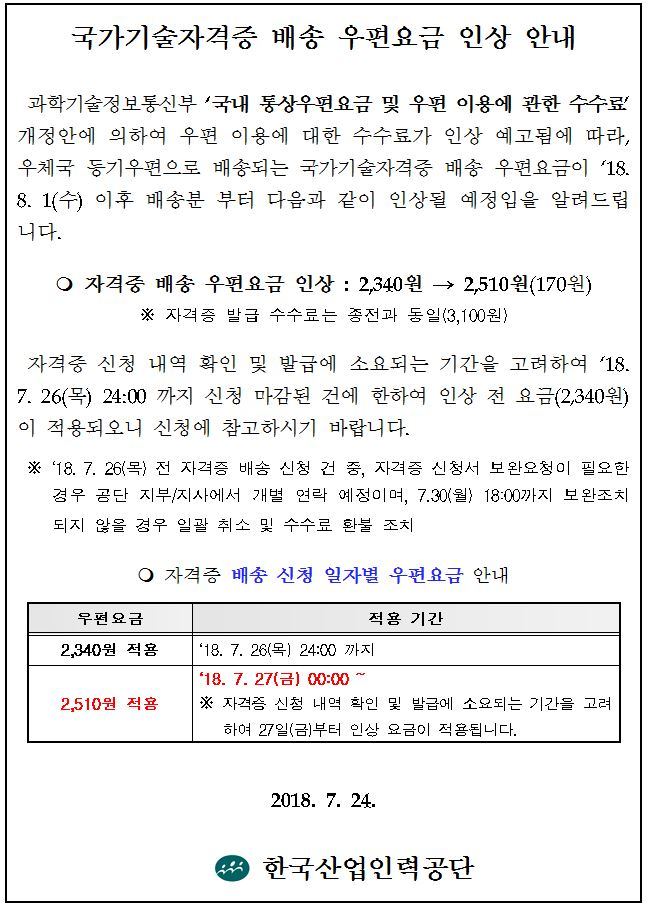 국가기술자격증 배송 우편요금 인상 안내 공지